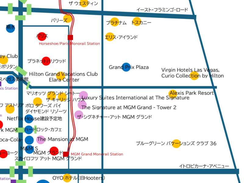 このエリアでは、「MGM Grand Monorail Station」と「Horseshoe/Paris Monorail Station」という2つの駅があります。