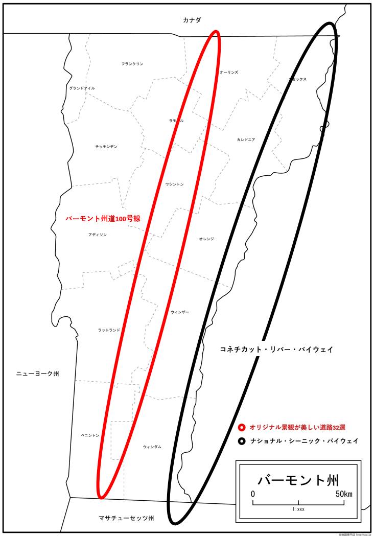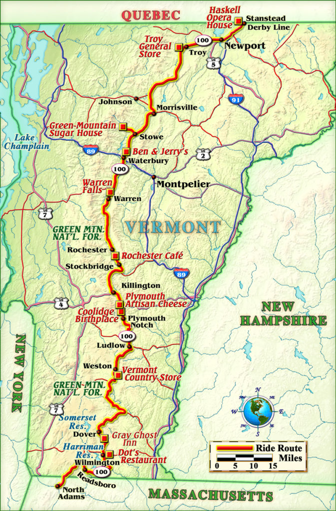 州南端のマサチューセッツ州境から北端のカナダ国境近くまで,全長約348kmにわたって走る州道で,「バーモントの背骨:The Spine of Vermont」とも呼ばれます。
