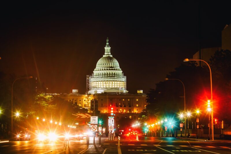 この写真は,「アメリカ合衆国議会議事堂:U.S. Capitol」を西側から見た夜景で,写っている通りは「ペンシルベニア・アベニュー:Pennsylvania Avenue NW」です。